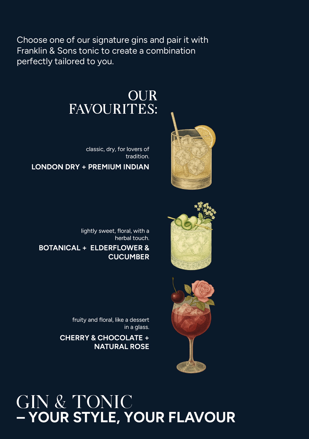 At Ginnery Bar, we invite you to become the creator of your perfect Gin & Tonic. Choose from our exclusive selection of handcrafted British gins, each offering its own unique character—whether it's the classic London Dry Gin, the sweet Quince, the low-ABV Sloe Gin Liqueur, or the floral Botanical Gin. Pair your choice with a range of premium mixers and fresh garnishes to design a G&T that’s perfectly tailored to your taste. Our knowledgeable staff is here to guide you through the process and help you craft a drink that’s uniquely yours.